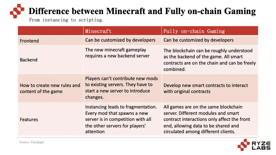 Minecraft 的新玩法的创建都需要搭建新的服务器,而全链游戏的差异点在于共享同一个后端,不同的模组和智能合约交互只是影响了前端,从而使得数据在不同的客户端里面可以共享和流通。