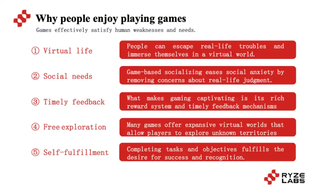 从 statista 的数据可以看出,目前全球的游戏玩家数量已经超过 25 亿,接近 30 亿。那么游戏是如何能够吸引全球超过三分之一的人参与呢,最核心的原因可以总结从多方面满足了人性的需求和弱点: