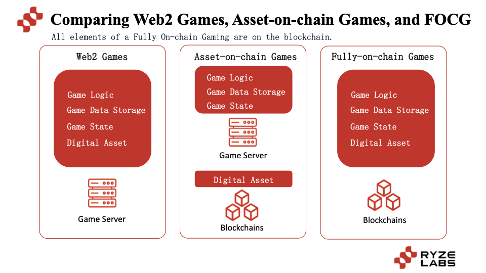 而最近备受关注的全链游戏将游戏所有的交互行为和状态全部上链,包括刚刚提到的游戏逻辑、数据存储、数字资产和游戏状态,全部都由区块链处理,从而实现真正的去中心化游戏。