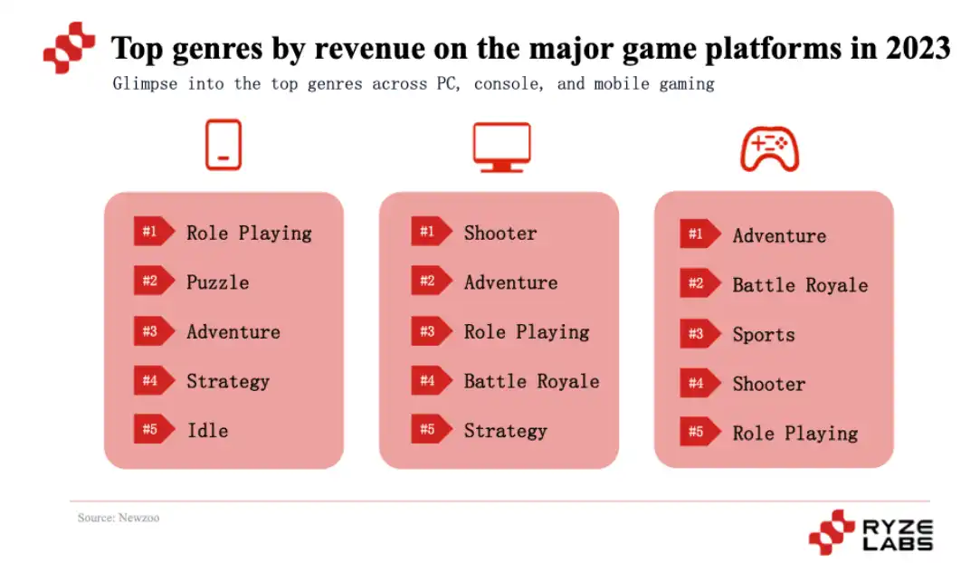 根据 Newzoo 的数据可以看出,角色扮演、冒险类这两类游戏在 PC 端、移动端和主机端都表现优异,均排名前五,此外像射击类和大逃杀类型的游戏在 PC 端和主机端都非常受欢迎。移动端略显不同的是,解谜类和放置类的游戏也比较受用户的喜爱。