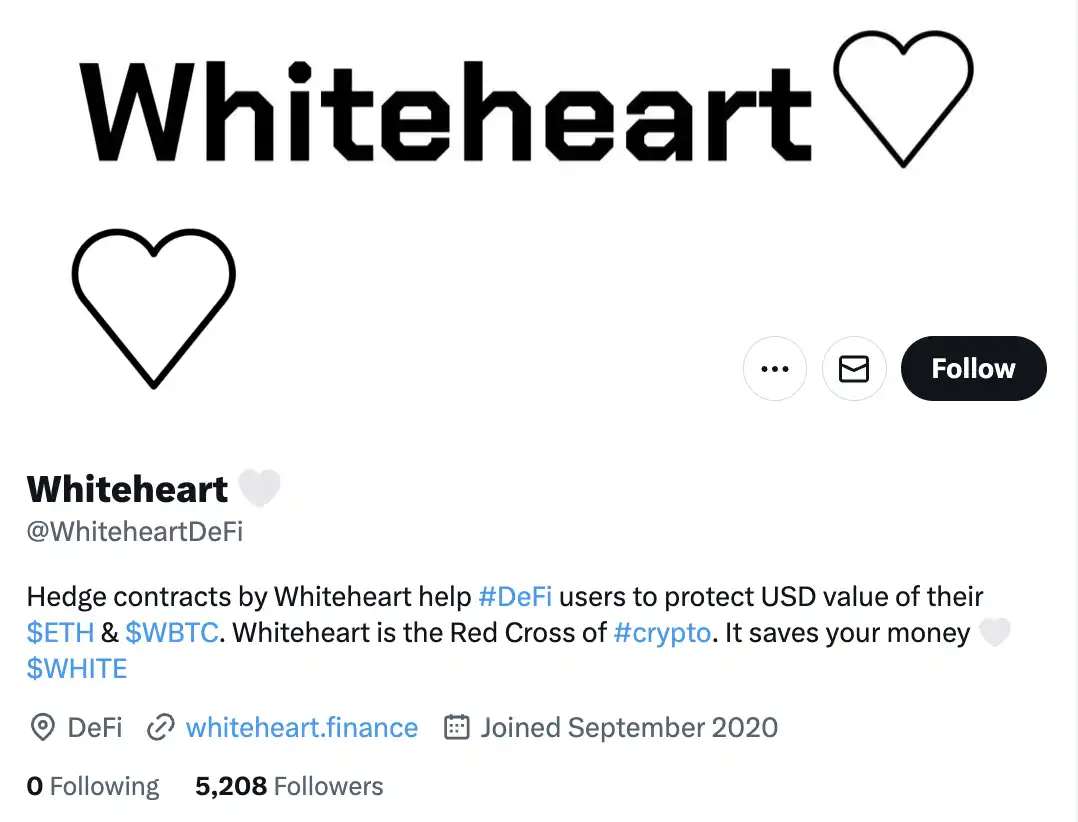 Whiteheart 建立在 Hegic 之上,其想解决的问题是使用对冲合约帮助 DeFi 用户保护其持有的 ETH 和 WBTC 价值免受下跌影响。故此,Whiteheart 的官方推特简介中称自己为 Crypto 的红十字会,但这个账户在 2021 年 7 月之后就再未更新。