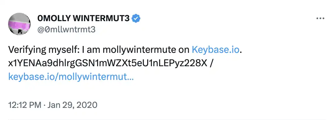 但这位匿名者有自己的推特账户,Molly Wintermute 的第一条推文出现于 2020 年 1 月 28 日。Molly Wintermute 表示:「验证我自己:我是 http://Keybase.io 上的 mollywintermute。」