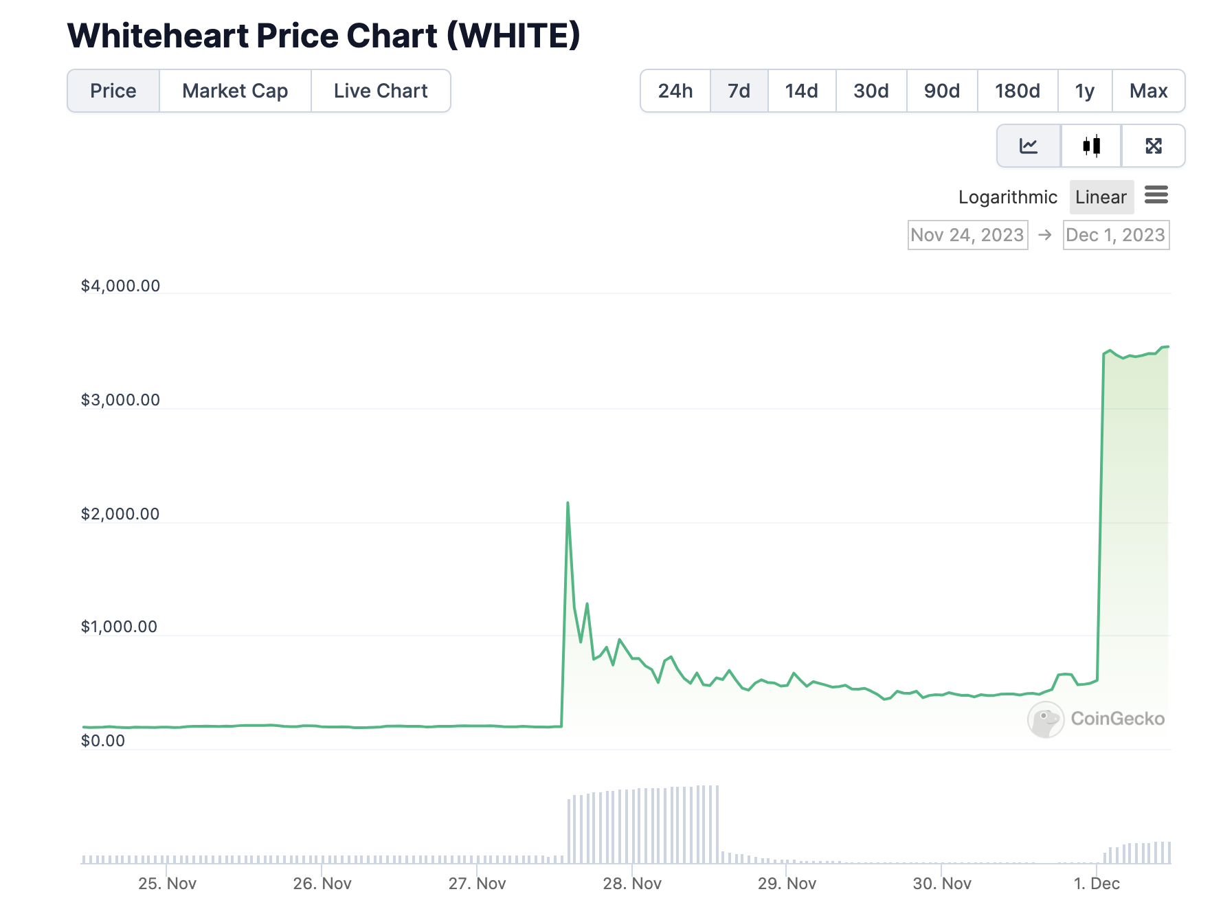 据 CoinGecko 数据,截至撰稿前,Whiteheart(WHITE)价格为 3599 美元,24 小时内价格上涨了 633.96%,过去 7 天内价格上涨了 1783.24%。如果你没有听说过这个项目,没关系,因为其他人也没有听说过。但不幸的是,Whiteheart 要关停了。
