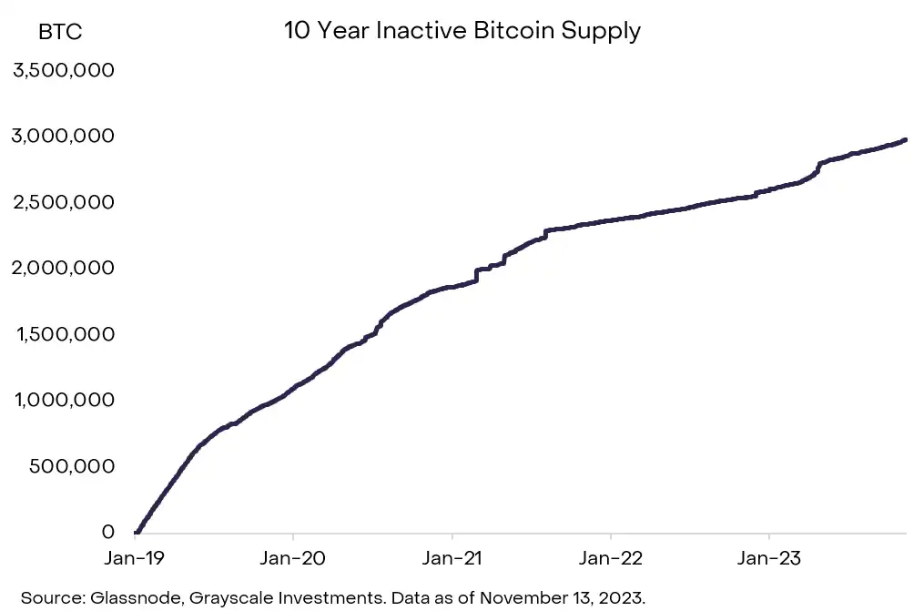注:Grayscale 的持有反映在「ETF 和基金」类别中。此类别包括基于期货的产品和其他持有比特币的基金。来源:Bitcoin Treasuries、Arkham Intelligence、Glassnode、Bitinfocharts。注:某些群体之间可能存在一些重叠(例如,供应在过去 10 年最后活跃和矿工)。所有数据截至 2023 年 11 月 13 日,仅供说明目的,可能会发生变化。