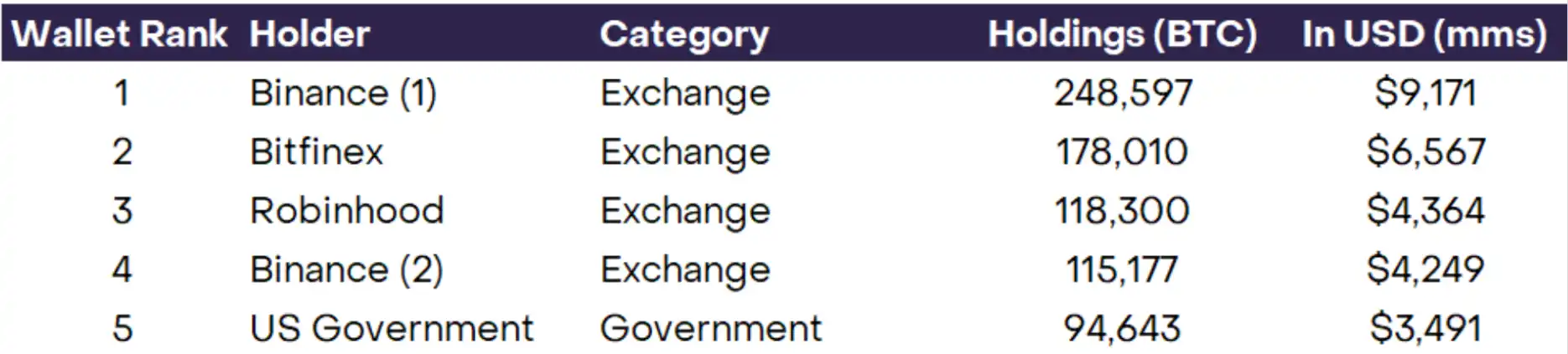 图 2:按余额排名的前 5 个总体比特币钱包地址