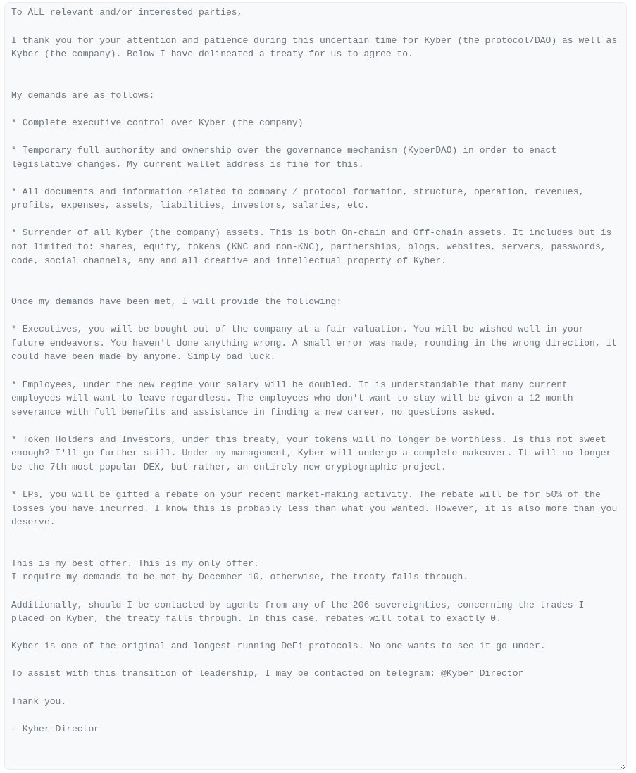 黑客的核心诉求是对 Kyber 进行完全控制,拥有 KyberDAO 的所有权。除此之外所有与公司、协议的形成、结构、运营、收入、利润、开支、资产、负债、投资者、薪水等相关的文件和信息。并且还要求原项目方人员放弃所有 Kyber 资产,包括链上和链下的资产。范围包括但不限于:股份、权益、代币(KNC 和非 KNC)、合作伙伴关系、博客、网站、服务器、密码、代码、社交渠道,以及 Kyber 的一切创意和知识产权。