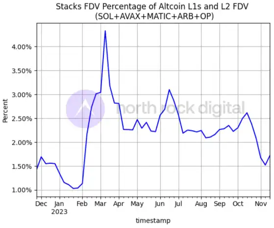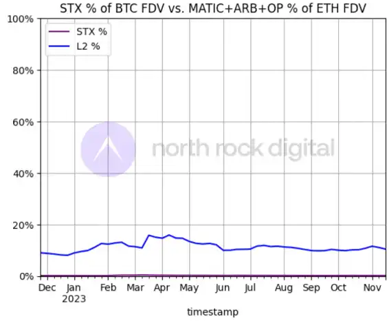 STX 与 BTC 以及与其他第一层/第二层(L1/L2)生态系统的相对估值现在也达到令人侧目的水平。预计到明年四月份,Stacks 很可能最终完成了中本聪升级,使其能够提供首个完全运行的以 BTC 计价的生态系统。与此同时我们将接近 BTC 减半,而 Stacks 生态系统将处于其营销活动的中期。这应该为 STX 提供一个有利的环境,以缩小其相对于这些其他资产的估值折扣。STX 目前的交易价格为 BTC 的全稀释市值(FDV)的 0.15%,而以太坊 L2 的交易价格总和为 ETH 的 FDV 的 10%。虽然折扣是合理的,但目前折扣的大小显示了 STX 的无限潜在上升空间,因为它通过中本聪升级大幅提高了其能力,并随着时间的推移逐渐成为真正的 BTC 第二层(L2)。