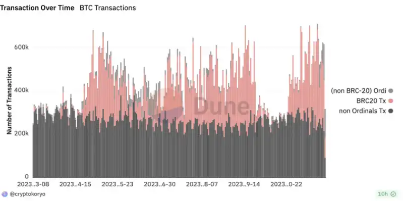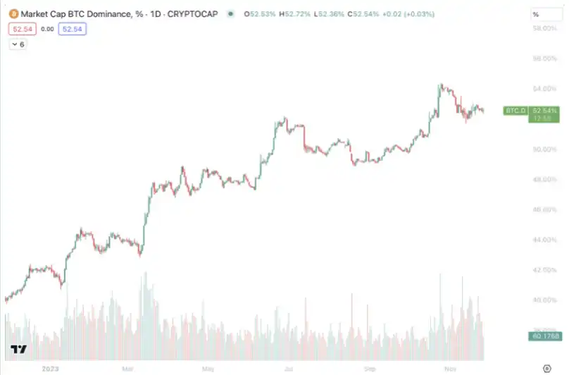 比特币网络的平均燃料费用今年已经飙升了 50 倍(相比之下,以太坊为 2 倍),由此可见,在比特币领域对区块空间的需求依然强劲。Ordinals 的持续发展进一步显示了人们想要利用比特币做更多事情,而不仅仅是简单地持有它。比特币资产本身作为全球宏观资产的地位得到加强,市场对替代存储价值(SOV)的需求也在增加,因此比特币的主导地位也在水长船高。