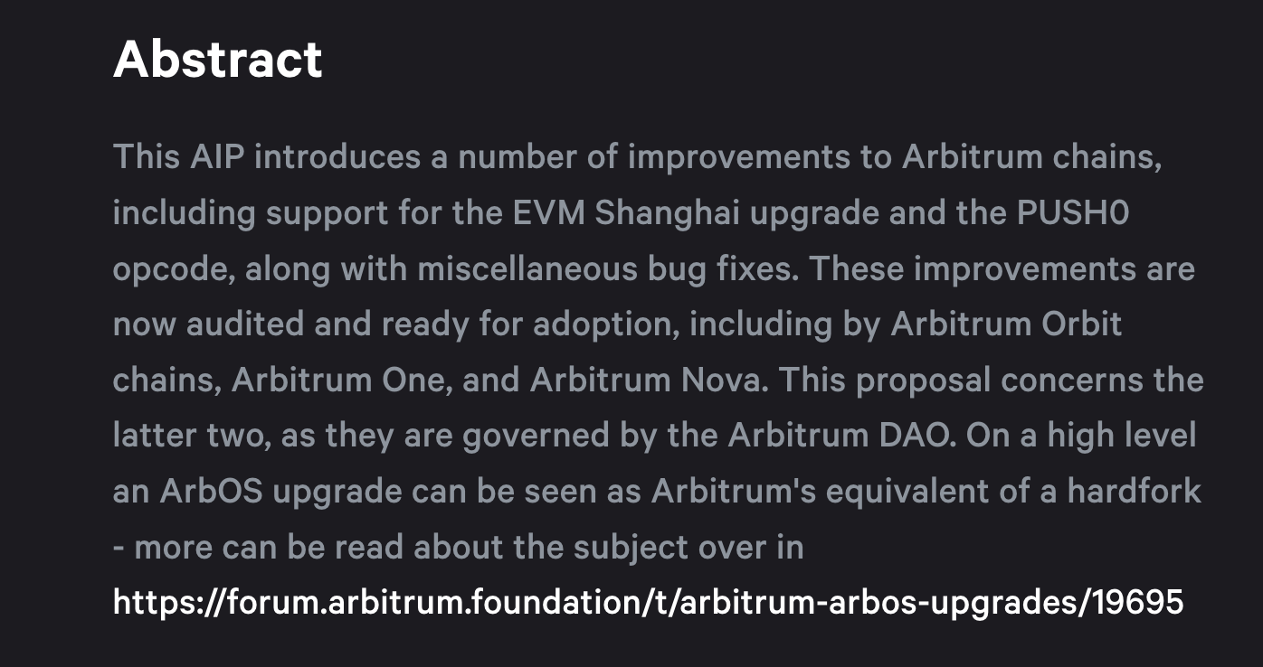 11 月 28 日,Arbitrum 社区开启「ArbOS V11」AIP 提案投票,而这项提案指出:「在较高层面上,ArbOS 升级可以被视为 Arbitrum 的硬分叉。」