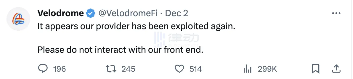第二天,也就是 11 月 30 日,Velodrome 宣布重新获得了对域名的控制权。但在两天后的 12 月 2 日,Velodrome表示其服务提供商疑似再次受到攻击:「看来我们的提供商又被利用了,请不要与我们的前端交互。」