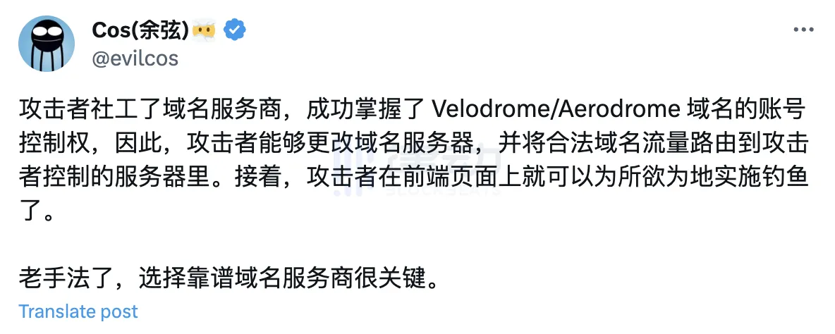 慢雾科技创始人余弦(@evilcos)对此评论表示,攻击者掌握了 Velodrome/Aerodrome 域名的账号控制权,因此能够更改域名服务器,并将合法域名流量路由到攻击者控制的服务器里。接着,攻击者在前端页面上就可以钓鱼了:「选择靠谱域名服务商很关键」。