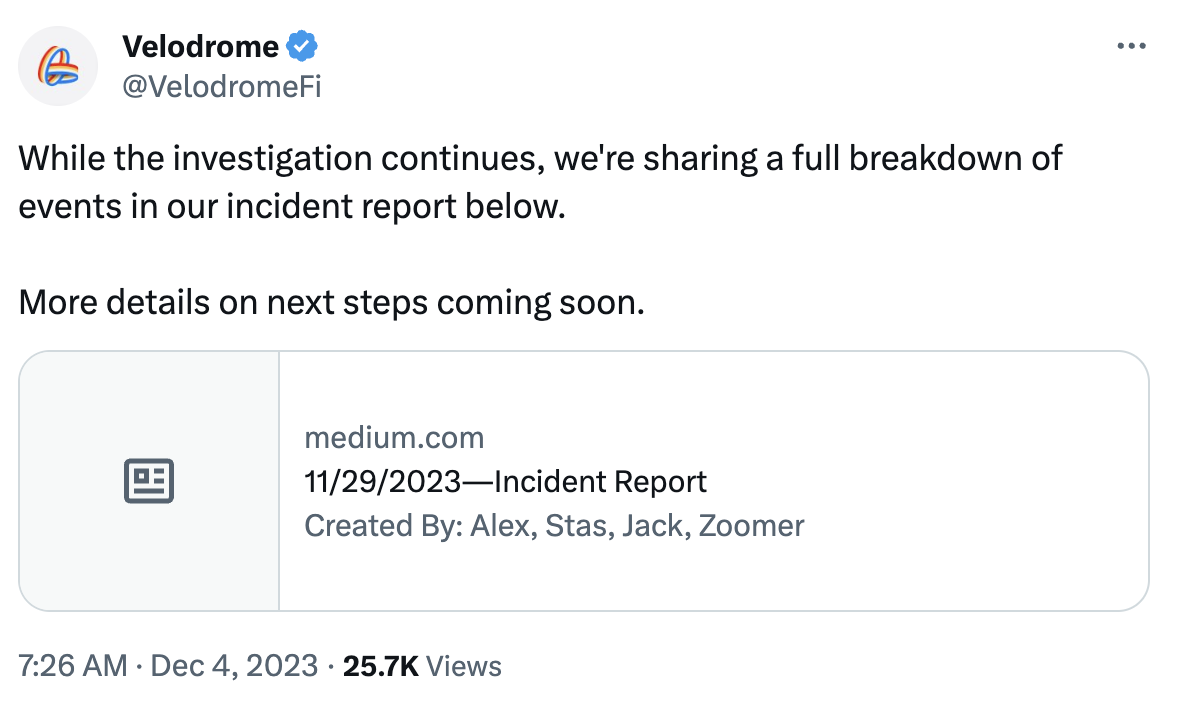 12 月 4 日,Optimism 上 AMM 协议 Velodrome 发布 11 月 29 日 DNS 攻击事件事故报告,解释 velodrome.finance 和 aerodrome.finance 资金被抽走的技术和原因。