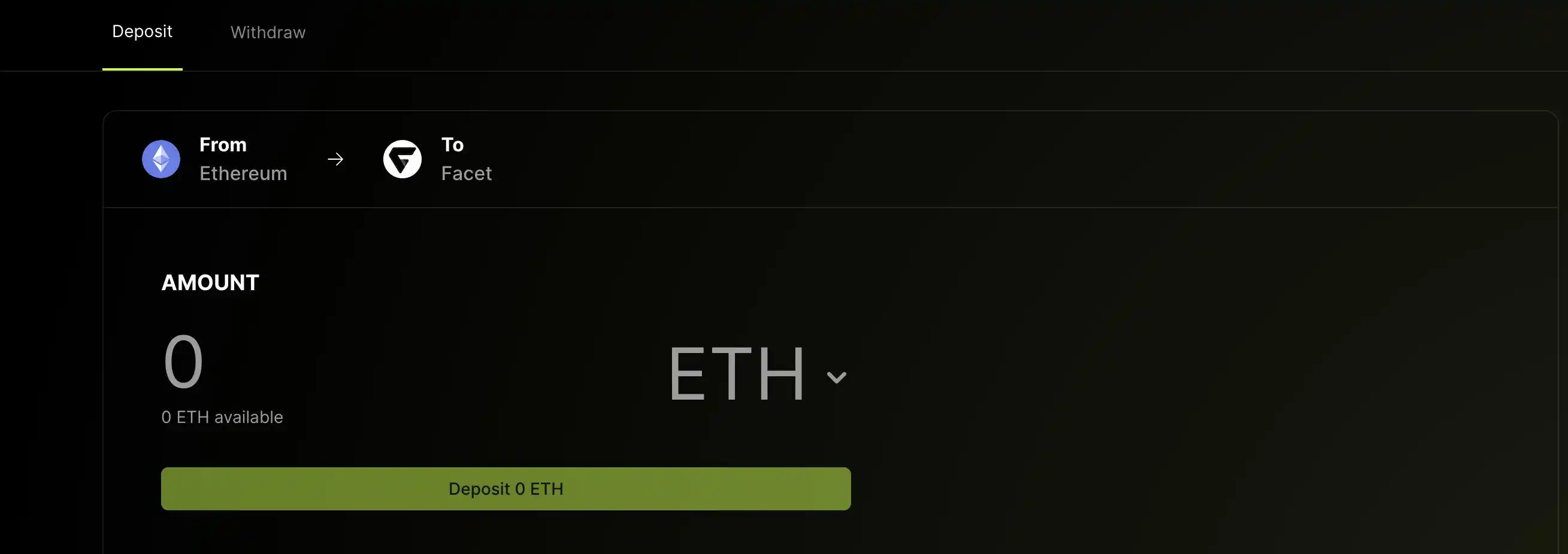 2. 输入你想要跨链的 ETH 金额,必须跨为 FETH 才能使用 Facetswap,但结算时用的主网 ETH 当作 Gas。