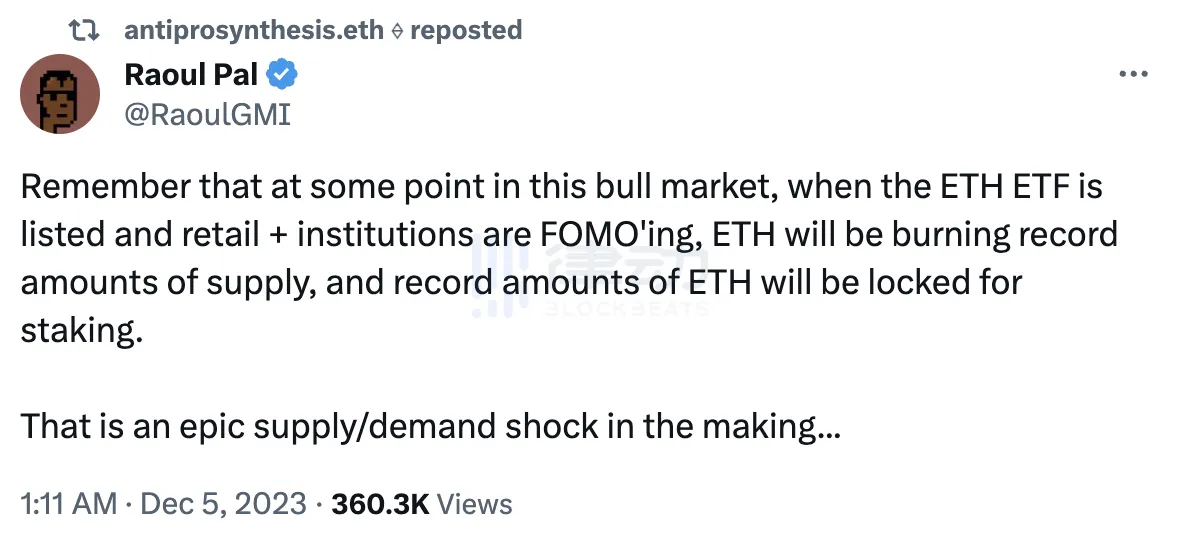 高盛前高管、宏观研究机构 real vision 创始人 Raoul Pal(@RaoulGMI)也发文表示:「请记住,在这个牛市的某个时刻,当 ETH 的 ETF 上市并且散户和机构都害怕错过机会时,ETH 将燃烧创纪录的供应量,并且创纪录的 ETH 数量将被锁定用于质押。」