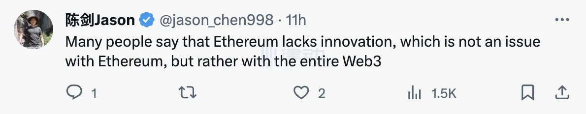 万物研究院的陈剑 Jason(@jason_chen998)则表示:「很多人说以太坊缺乏创新,这不是以太坊的问题,而是整个 Web3 的问题。」