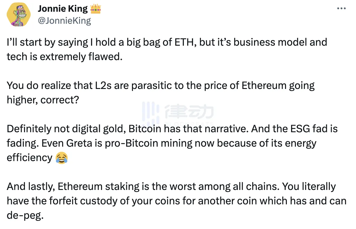 社区开发者 Jonnie King(@JonnieKing)认为以太坊有三个比较致命的点:以太坊的商业模式和技术都存在极大缺陷、L2 十分依赖 ETH 价格的上涨、以太坊的质押是所有链中最差的:「我确实相信以太坊将在未来几年内得到改善,但在目前的状态下,它存在严重缺陷,而竞争对手正在解决基础层上的这些缺陷。这就是市场如此对待它的原因。」