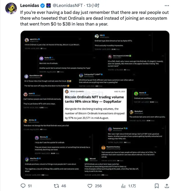 今天在比特币生态流传的一张截图上,显示了过往一些真实的人在唱衰 Ordinals 已经死了。比特币生态早期参与者@LeonidasNFT 在自己的社交媒体说到:「这些人错过了参与一个在不到一年的时间里从无到 30 亿美金的生态系统。」
