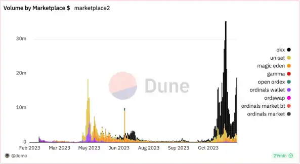 随着市场对 BTC ETF 的期待情绪一再升温,BTC 已突破 4 万美元的关口,继续向年内新高冲刺。而 BTC 的 Ordinals 也在 BTC 上涨的推波助澜下交易持续活跃:据 Dune Analytics 数据显示,12 月 3 日比特币 Ordinals 铭文主流平台的单日交易量已上升至约 1594 万美元,相比 11 月 26 日 494 万美元的近日低点,涨幅超过 200%。