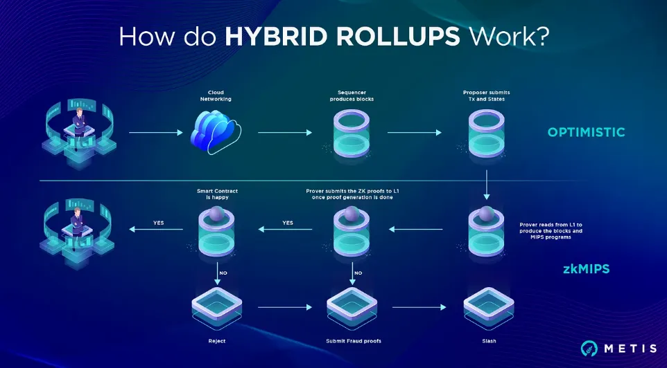 2023 年 3 月 2 日,MetisDAO 宣布正在构建「有史以来第一个混合 Rollup,将 Optimistic Rollup 架构与零知识证明 zk 相结合。