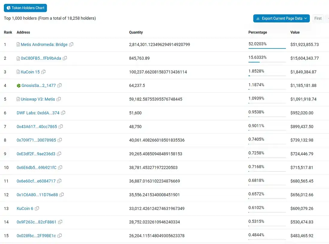 从 Metis 网络的数量来看,在 22 年 6 月之前有快速的增长,有两次是阶梯式的增长,很可能是解锁后的筹码。在 22 年 5 月达到最高的 288 万,最后的 18 个月,是先有小的下降,最低下降到 261 万,之后又开始回升,最近回升到 281 万。所以在 Metis 主网内的代币基本比较稳定。