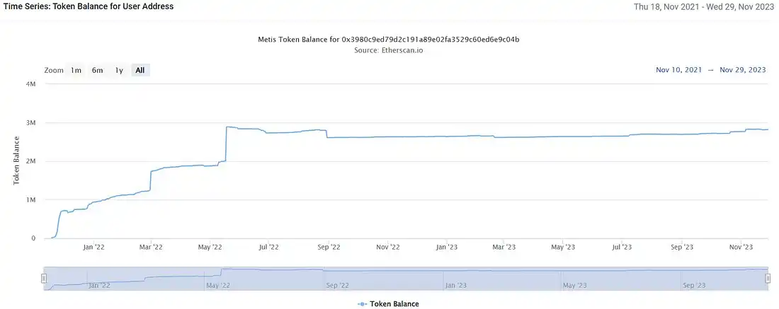 持仓地址 2:推测是投资人和团队,初始生成了 300 万 Metis,现已完全解锁,钱包内还剩余 84.5 万枚。