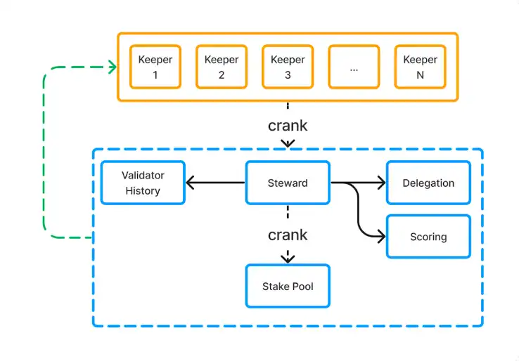 ·Keepers Network 则会根据 Steward Program 的计算结果,执行质押委托金额的分配。