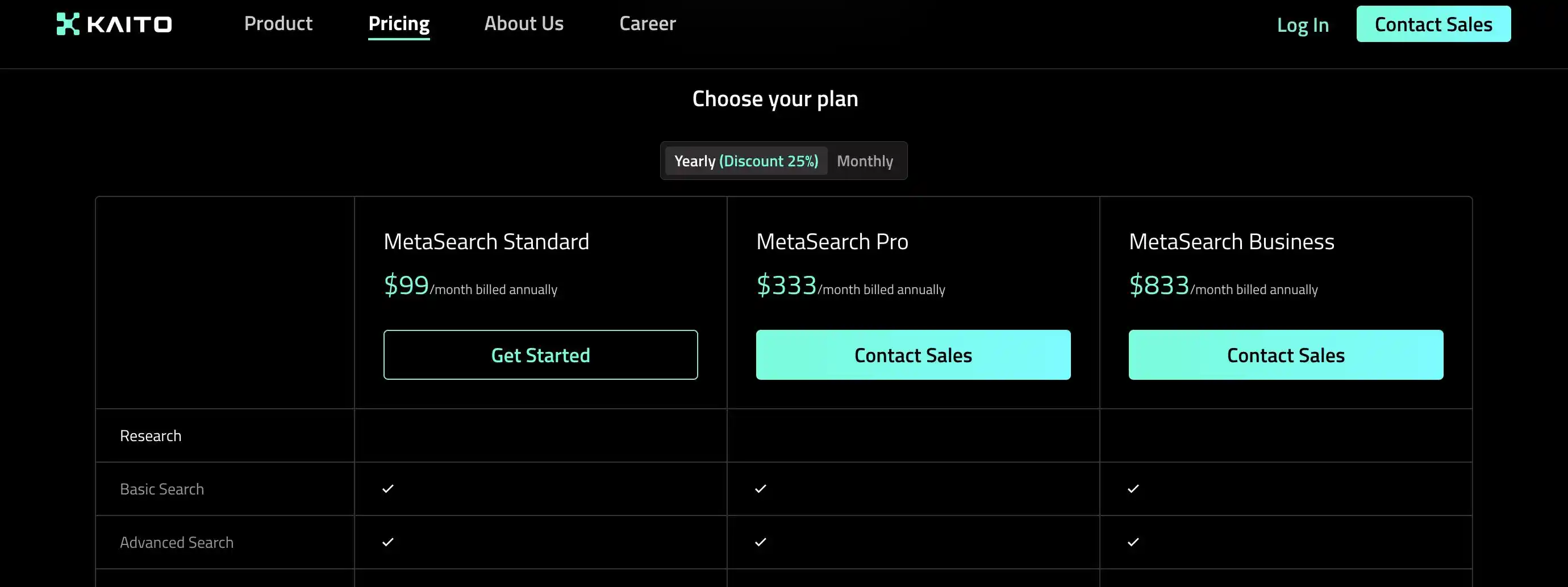 MetaSearch 是 Kaito 的主要产品。通过 MetaSearch,用户能够一键式搜索加密领域的所有平台,包括: Twitter、Discord、治理论坛、Mirror、Medium 等。