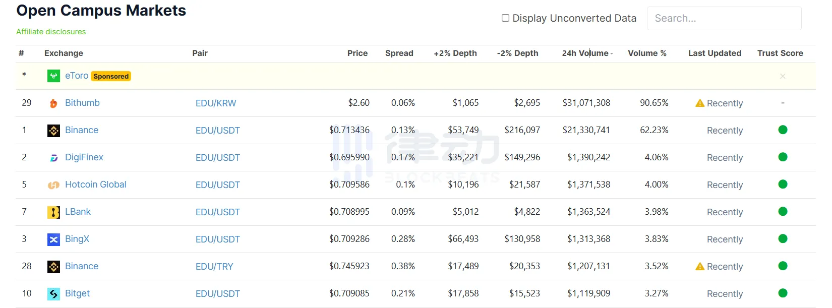 Bithumb 上 EDU 现报价 2.6 美元,较主流 CEX 溢价超 250%