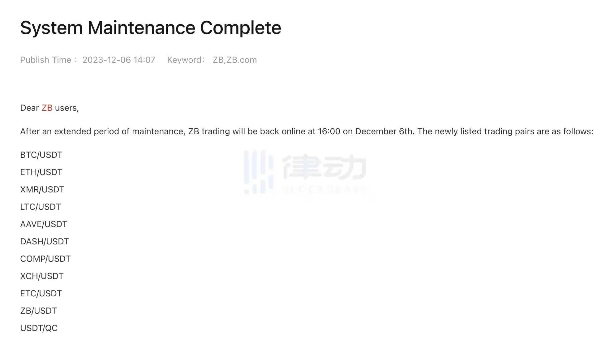 12 月 7 日,加密交易平台中币(ZB)发布公告称,经过长时间的维护,交易于 12 月 6 日 16:00 重新上线。新上线的交易对包括: