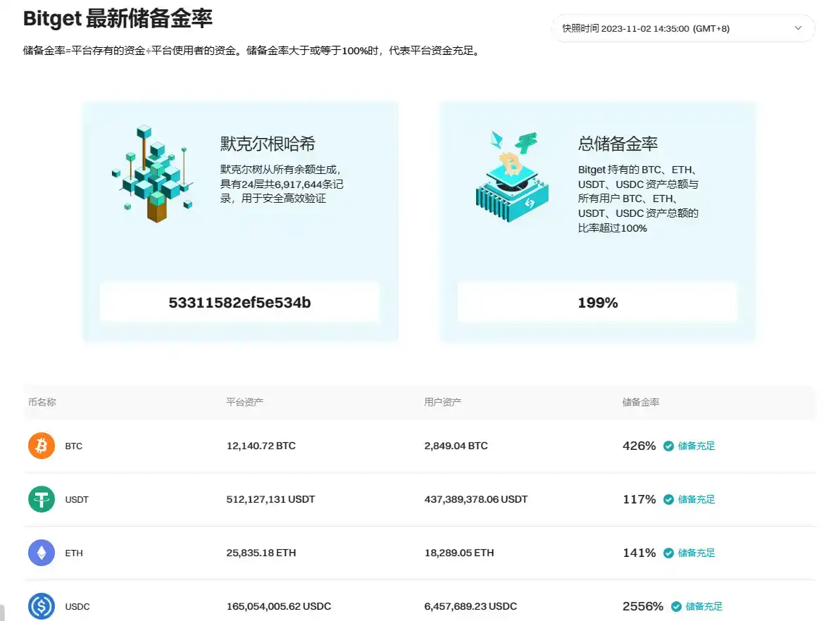 12 月 7 日,Bitget 公布最新储备金数据。综合储备金率为 171%,其中 BTC、ETH、USDT、USDC 的储备金率分别为 381%、151%、102% 和 586%。