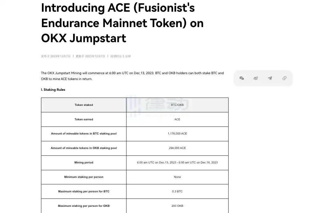 12 月 7 日,据官方公告,OKX Jumpstart 上线新项目 Fusionist(ACE)。
