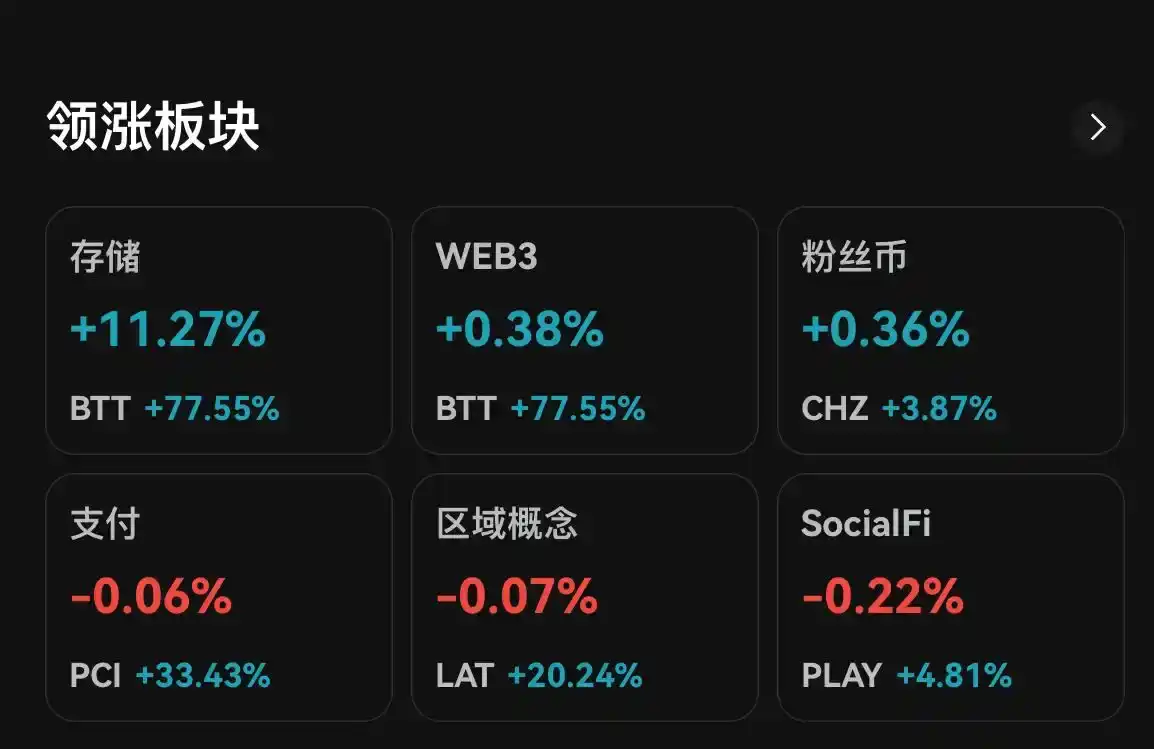 12 月 7 日,据 Bitget 行情显示,领涨板块分别为存储,Web3 以及粉丝币板块,其中 BTT 24 小时涨幅 77.55%,CHZ 24 小时涨幅为 3.87%。