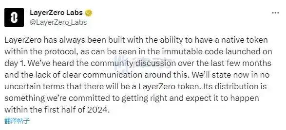 12 月 8 日,LayerZero Labs 在其社交平台明确表示,协议拥有原生代币。团队将致力于做好代币的分发工作,并预计在 2024 年上半年内完成。