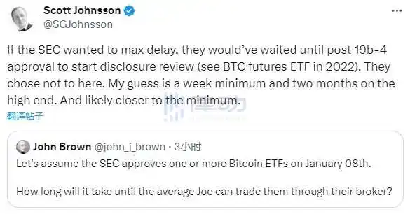 12 月 8 日,美国金融律师 Scott Johnsson 在其社交平台表示,若 SEC 于 1 月 8 日批准了一个或多个比特币现货 ETF,那么最快一周,最慢两个月便可允许经纪人交易该 ETF。