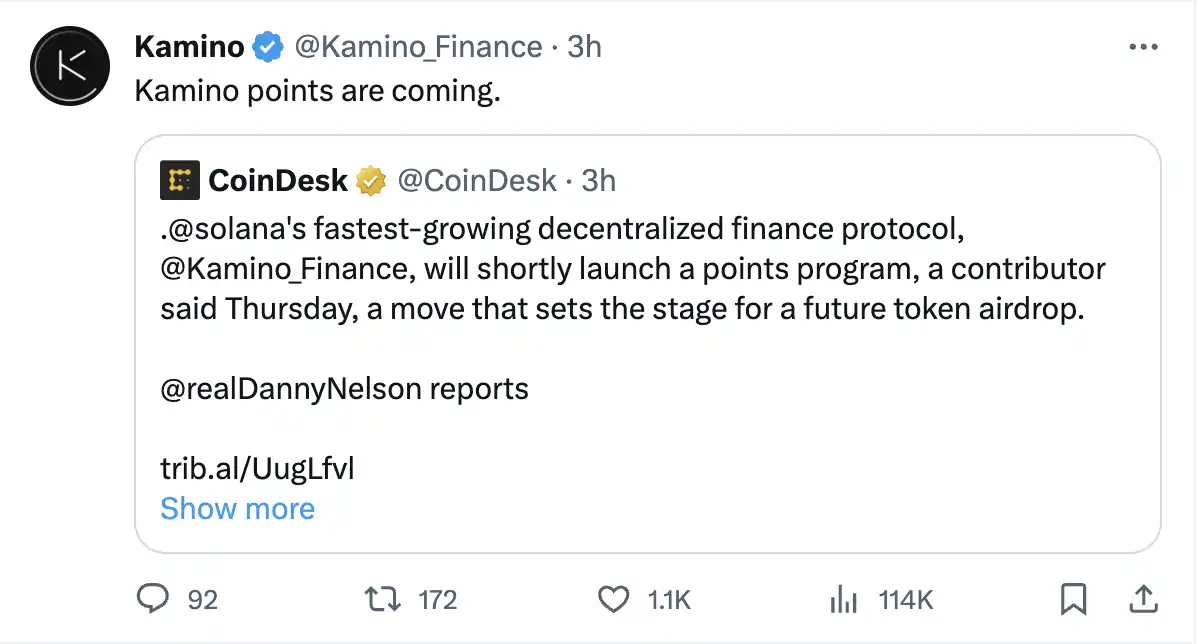 据 CoinDesk 报道,消息人士透露,Kamino 即将启动一项积分计划,社区用户 Marky 在 12 月 7 日的 Twitter Spaces 中表示,这「很可能成为未来的代币」。随后,Kamino 官方转发此报道并表示 Kamino 积分将会到来。