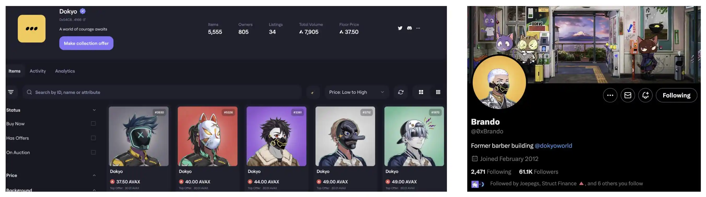 如果你留意 Avalanche 生态,你会看到很多人都换上了 Dokyo 的头像,其 NFT 共 5,555 个,目前地板价 37.5 $AVAX,目前已知的创始团队成员为 0xBrando。