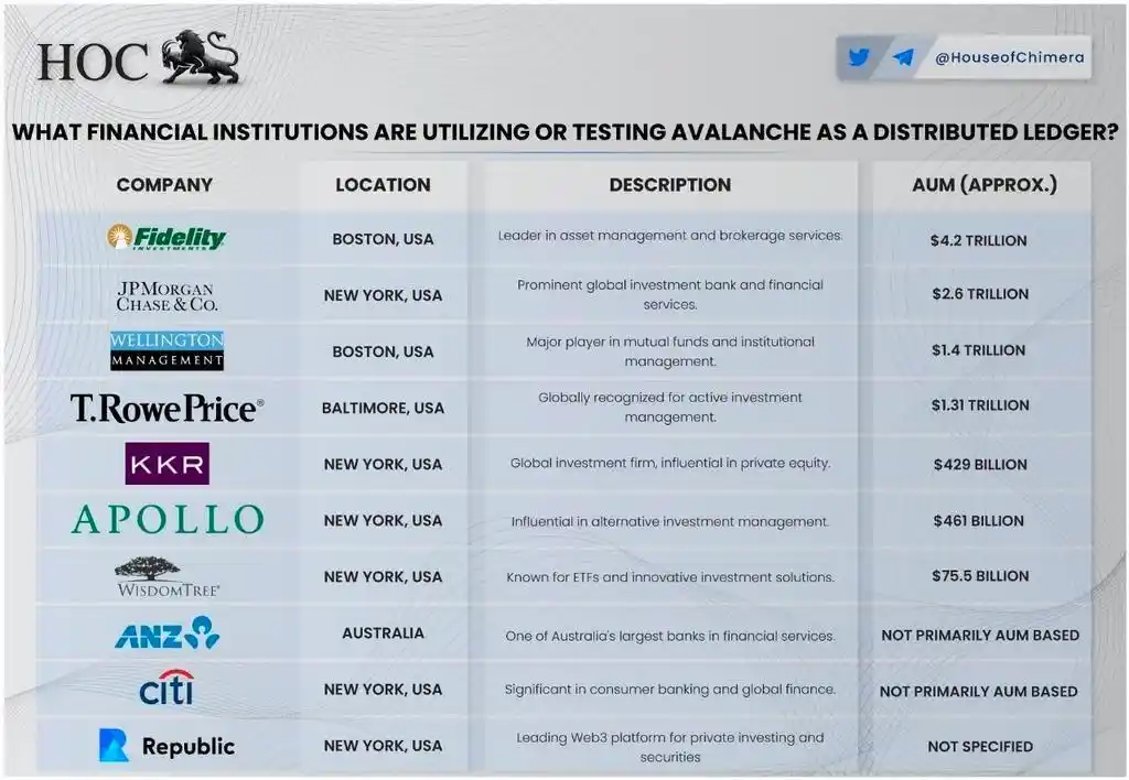 从公链自身的发展来看,Avalanche 最大的进展是在 RWA 和与企业合作的方向上。下图列出了正在使用或测试 Avalanche 的金融机构,包括:
