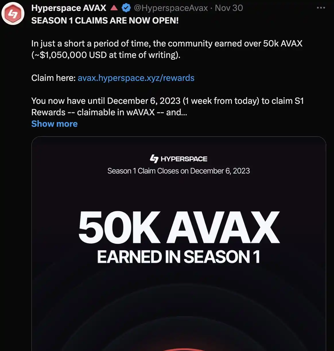 Hyperspace 是知名的跨链 NFT 平台,目前在 Avalanche 上推出了做任务得积分活动,并可以得到 $AVAX 奖励。在刚结束的 Season 1 上,一共送出了超过一百万美金的激励。