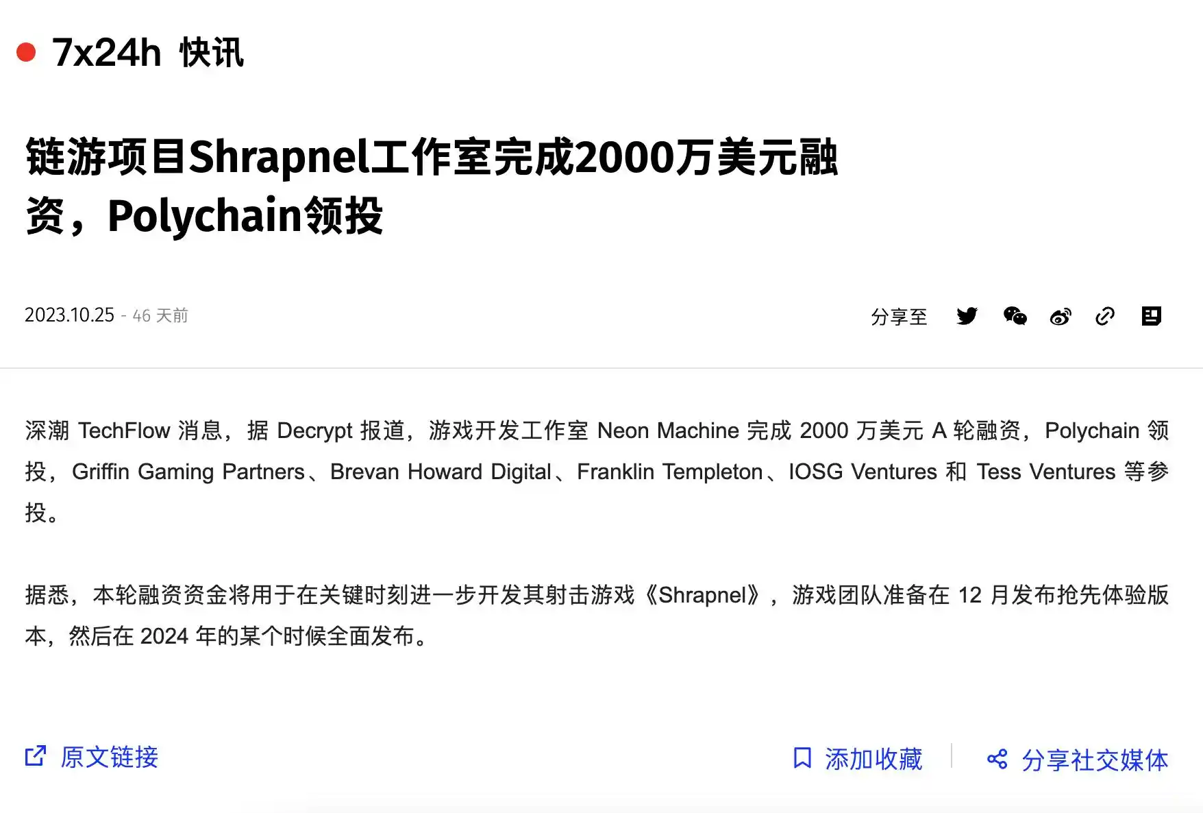 Shrapnel 之前放出过一些视频宣传片,并在很多 Avalanche 的活动上进行过线下测试,普遍反馈不错。同时在两个月前,该项目再一次拿到由 Polychain 领投的 2000 万美元融资。
