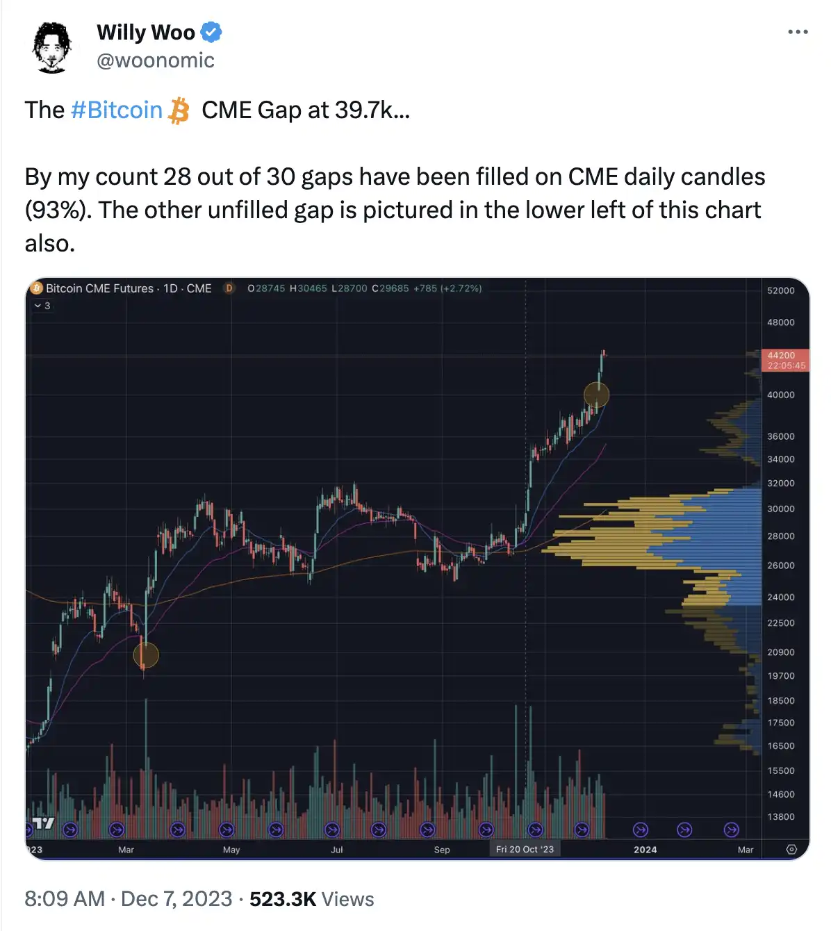 比特币 CME 缺口是指芝加哥商品交易所的比特币价格上涨,留下 39,700 美元的缺口,而从历史上看,这种缺口通常会被填补,这意味着价格经常会回到这个水平。CME 比特币期货市场的价格差距是由于其运营时间与美国交易时间一致而出现的,从而导致市场开盘和收盘时存在潜在的价格差异。