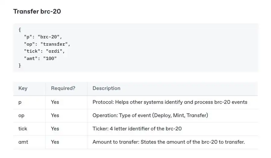 ·最后一个叫做 transfer 铭文,规定了 BRC20 之间的流传情况、流传数量等等。更多的细节,参考文档: https://layer1.gitbook.io/layer1-foundation/protocols/brc-20/documentation