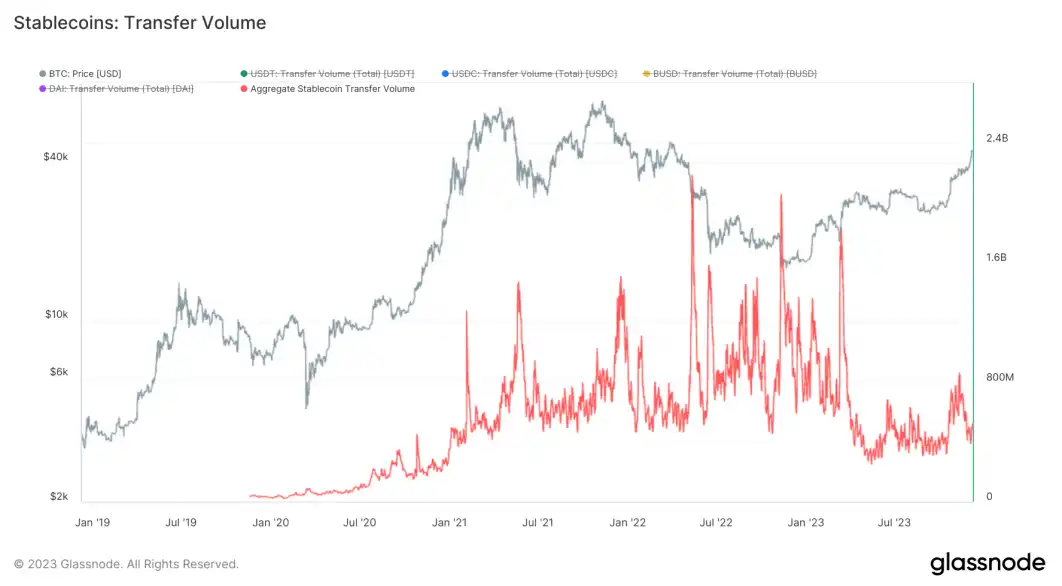 近期稳定币转移量有⼀定幅度上升的迹象。