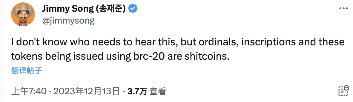 他和 Luke Dashjr 相似,一直是 Ordinals 的批评者。「我不知道谁需要听到这个,但使用 brc-20 发行的序数、铭文和这些代币都是垃圾币。」Jimmy Song 在自己的社交平台上这么说道。