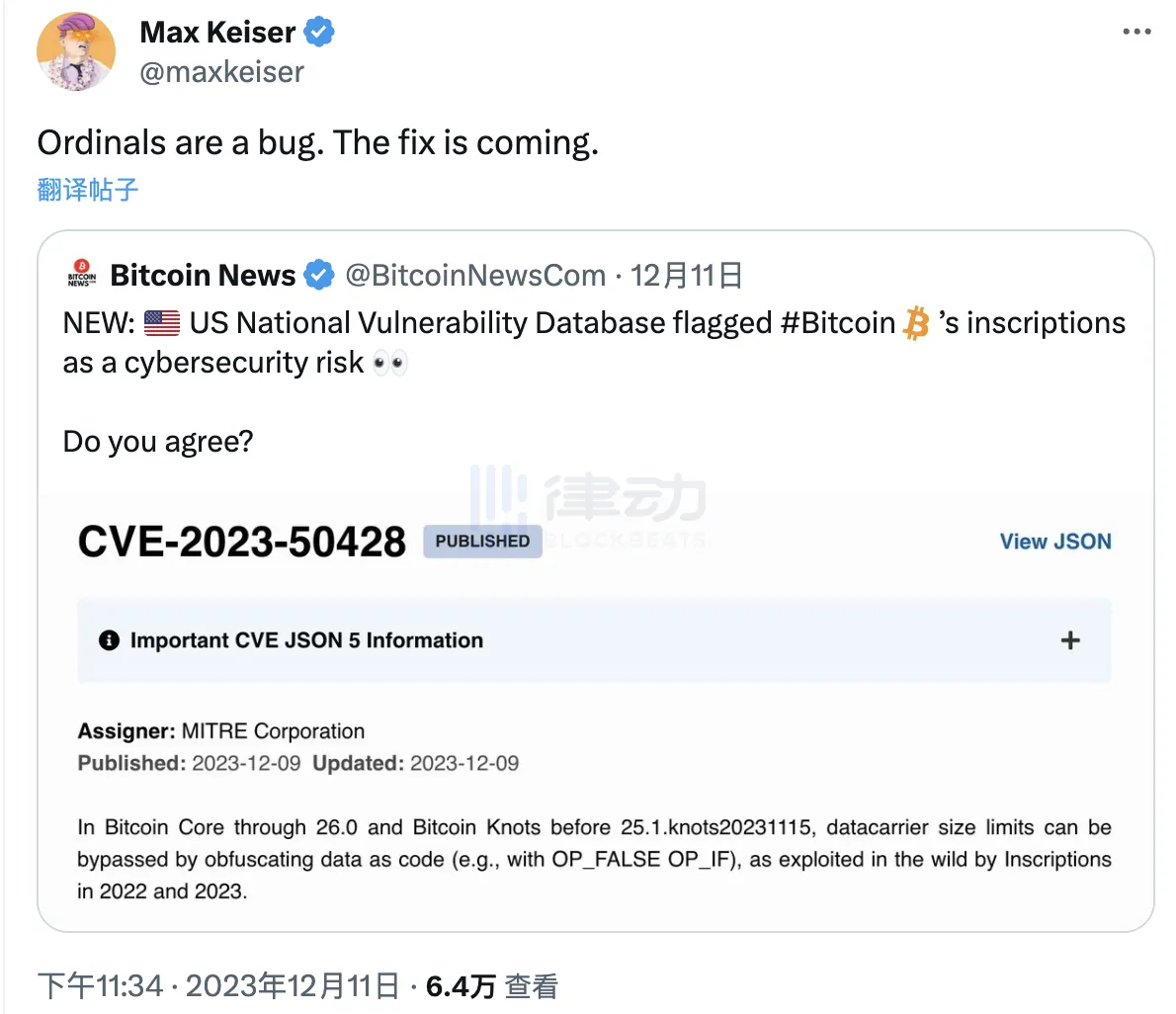 「序数是一个错误。修复即将到来。」Max Keiser 引用了 Ordinals 在美国国家漏洞数据库注册号为 CVE-2023-50428 的截图,这么说道。