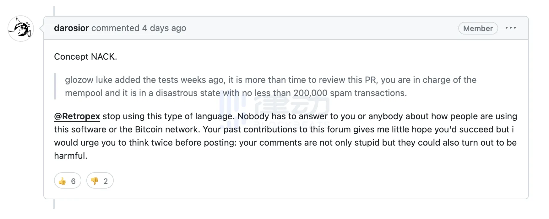 在 github 讨论中,比特币开发者 Retropex 支持 Luke,并表示:「glozow luke 几周前添加了这些测试,现在是审查这个拉取请求的时候了。你负责内存池,而内存池的状态非常糟糕,有不少于 20 万笔垃圾交易。」