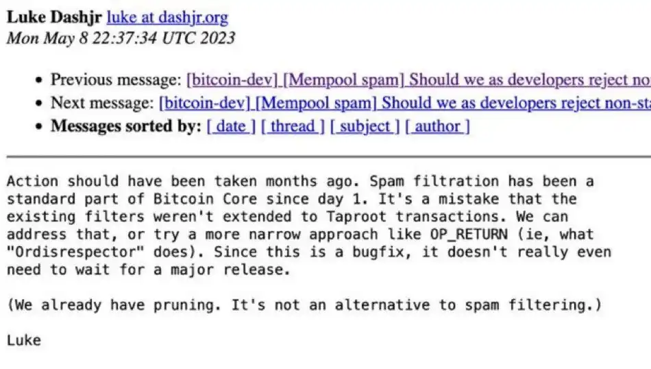 此前,在向其他比特币开发者和矿工发送的电子邮件中,Dashjr 为了阻止比特币网络中 Ordinals 和 BRC-20 代币的扩散,提议将「垃圾邮件过滤」机制集成到 Taproot 交易中。