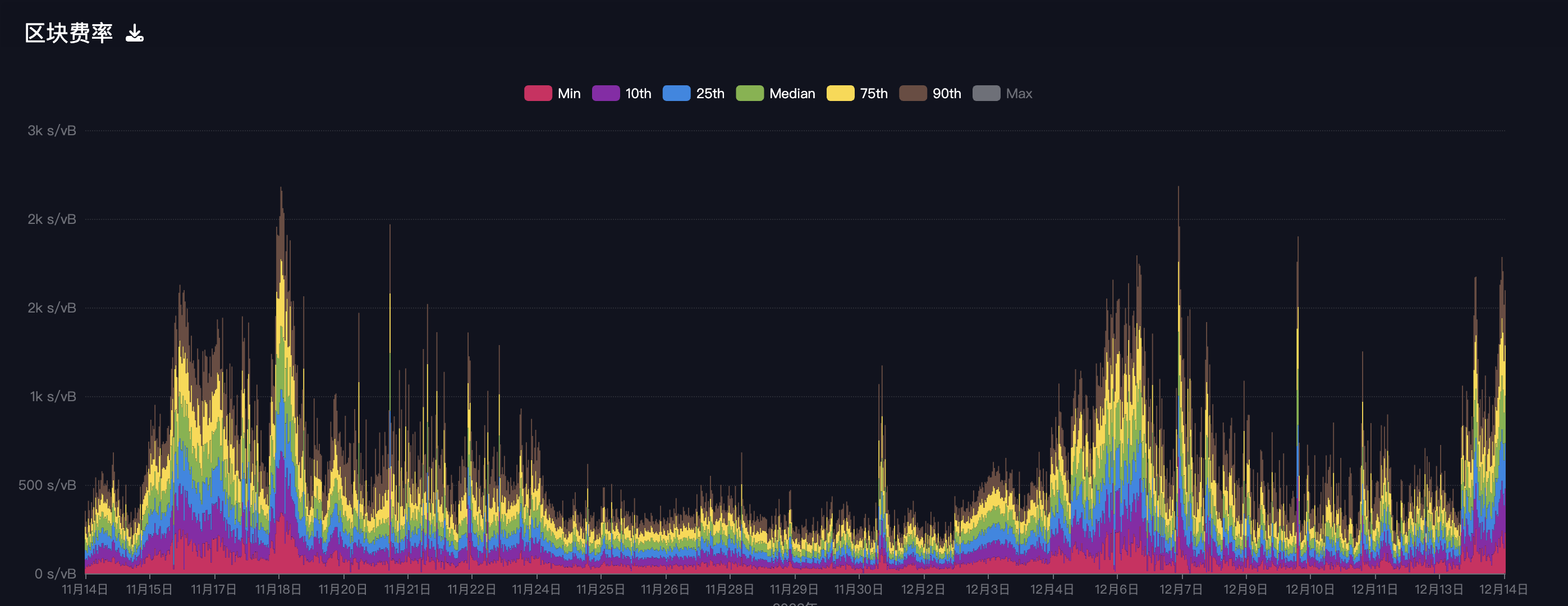 今日早些时候,据 Mempool.space 数据,比特币网络最佳手续费报 324 Satoshi/vbyte,全网未确认交易笔数达 278,087 笔。而观察比特币网络近一月的区块费率数据,可以发现近几天又达到了上一个高点的水平。