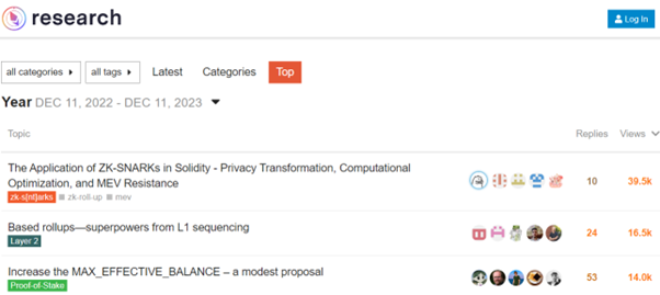 而且,研究者们在Ethereum Research平台上对 ZK 技术及其应用进行了激烈的讨论,其中,有一篇来自 Salus 的研究文章致力于利用 ZK 来促进以太坊应用层的隐私保护等实现。这篇文章测试了几种不同的 ZK 语言的性能,Circom、Noir 和 Halo2,结果显示,Circom 具有更好的性能。这篇文章也提出了一个通用性的解决方案,在 Solidity 中集成 Circom,可实现基于 ZK 的以太坊应用层项目。这对以太坊实现隐私过渡具有重要意义。这项研究在 2023 年获得了显著的关注度,位列榜首。