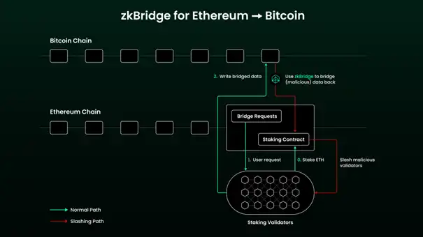 2. 在这种情况下,如果有质押者进行恶意行为,任何诚实的质押者或用户都可以在以太坊上报告这种欺诈行为。然后我们利用 zkBridge 将写入比特币网络上的相关数据传递到以太坊。。特别地,如上文介绍,以比特币作为发送链的单向 zkBridge 结构非常简单。我们的 zkBridge 包含了一个去中心化的零知识证明生成网络。网络中的任何节点都可以将比特币网络的当前区块头及其零知识证明传递到以太坊上。然后以太坊可以用这些区块头验证在比特币网络上出现的任何跨链交易。