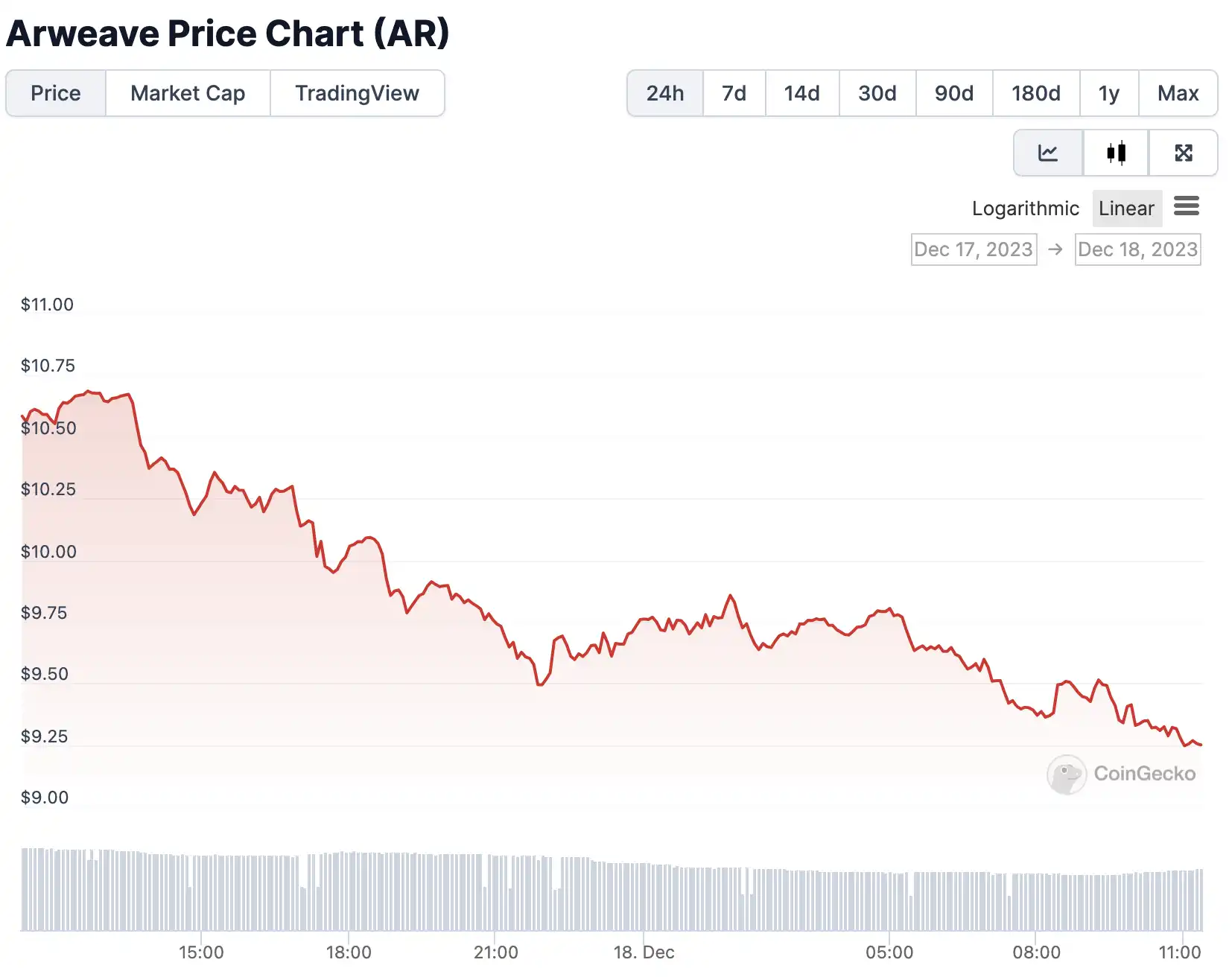 据 CoinGecko 数据显示,在 Arweave 创始人 Sam Williams 发文后,Arweave 代币 AR 价格出现小幅下降,1 小时下降 0.6%、24 小时跌幅达 12.3%,截止发稿时报价 9.28 美元。